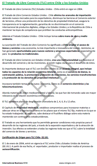 Además el tratado Estados Unidos-Chile incluye temas sobre mano de obra y medio ambiente. Puerto Rico es beneficiario de este acuerdo comercial. Comercio global Chile-Estados Unidos: