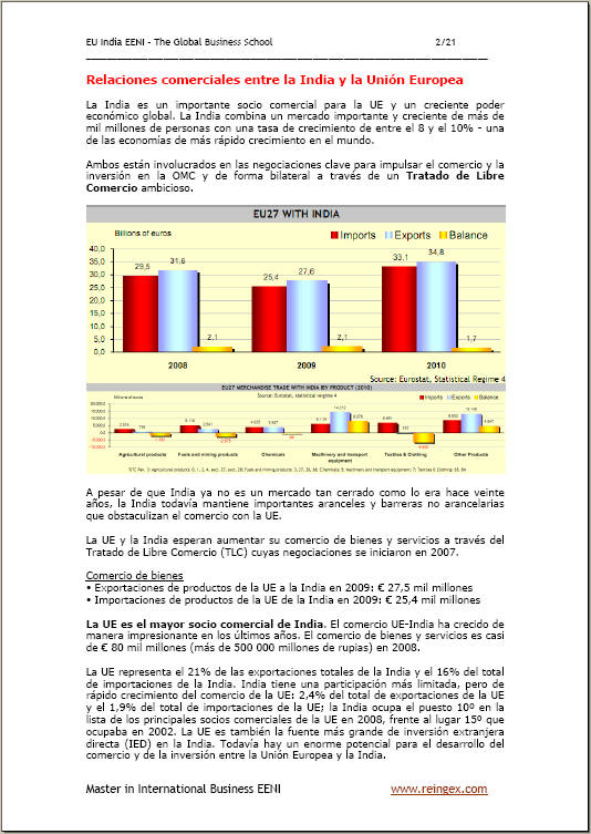 India tiene una participación más limitada, pero de rápido crecimiento del comercio internacional de la Unión Europea: 2,4% del total de exportaciones de la Unión Europea y el 1,9% del total de las importaciones de la Unión Europea; la República de India ocupa el puesto décimo en la lista de los principales socios comerciales de la Unión Europea. La Unión Europea es también la fuente más grande de inversión extranjera directa en India. Existe un formidable potencial para el desarrollo del comercio bilateral y de la inversión extranjera directa entre la UE y la India. Los exportadores españoles pueden beneficiarse del Tratado de libre comercio India-Unión Europea. El tratado de libre comercio entre India y la UE es un acuerdo entre el Espacio Económico Europeo de la Civilización Occidental y la civilización hindú. Acuerdos de India: Chile, MERCOSUR, Comunidad Andina, Unión Europea... Acuerdos de la Unión Europea: Comunidad Andina, CARIFORUM, MERCOSUR, México, América Central, Chile, Estados Unidos, SPG... (c) EENI Global Business School (1995-2025) |
