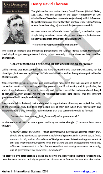 Influence on Gandhi. Hinduism influenced on Thoreau. “In the morning I wash my intelligence in the breathtaking and cosmogonal thinking of the Bhagavad Gita - Hinduism. Moreover, if we compare the Bhagavad Gita with which the modern world and its Literature seem weak and insignificant” Henry David Thoreau It is interesting to point out this mutual influence: The eternal religion, Hinduism, inspires a spiritual leader of Western Civilization, Thoreau. In Thoreau's work; we can see a significant similarity to Taoist thought (“The more laws, more thieves”). “That Government is best which governs least” Henry David Thoreau Henry David Thoreau also transmits in his works the concept of detachment from material goods, so common in Asian religions (Buddhism, Jainism, Zoroastrianism). “Luxury and comfort are not indispensable, are an obstacle to spiritual elevation of humanity” Thoreau The vision of Thoreau also influenced personalities like Marcel Proust, Ernest Hemingway, Frank Lloyd Wright, George Bernard Shaw, John F. Kennedy. In 1998, President Clinton recognized the principle of civil disobedience as alternatives to violence. While Thoreau was Transcendentalists; we have included in this study on Christianity, not for his religion, but because he belongs to Christian Civilization and for being a true spiritual leader of Non-Violence. (c) EENI Global Business School (1995-2025)