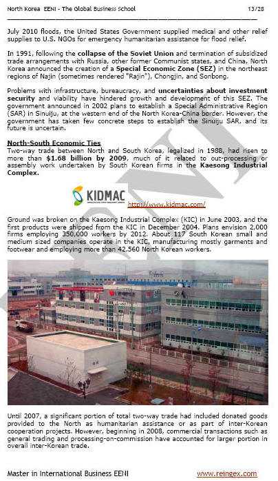 International Trade between the North and South Korea, legalized in 1988, had risen to near 1.68 billion dollars, much of it related to out-processing or assembly work undertaken by firms of South Korea in the Kaesong Industrial Complex