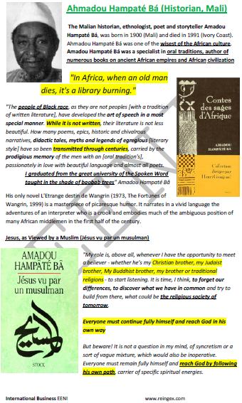 aspirations, times, and countries. All doctrines are only so many paths, but a path is by no means God Himself. Take a bow and worship where others kneel, for which so many have paid a tribute of veneration, the good Lord should, as it is all compassion. The Savior is the messenger of God. So whenever there is any waning of religion in any part of the World, God sends His Savior there. It is one and the same Savior that, having plunged into the ocean of life, rises up in one place and is known as Sri Krishna, and diving again rises in another place and is known as Christ. Everyone should follow his religion. A Christian should follow Christianity; a Muslim should follow Islam, and so on. For Hinduism, the old way, the way of the Aryan wises is the best.” Many Hindus even consider him a divine incarnation. For Mahatma Gandhi: “Ramakrishna was an incarnation of divinity. Their words are not those of a merely learned man, are the pages of the book of life. They are Revelations of their experiences. Ramakrishna's life has been a lesson of Ahimsa (Non-Violence). Their love knew no boundaries, geographical or otherwise. May his divine love be an inspiration to all.” Swami Vivekananda (1863 - 1902), was a monk (Hinduism) and the major disciple of Sri Ramakrishna. He was a key figure in the introduction of Indian philosophies of Vedanta and Yoga in Western, revival of Hinduism in India as well as in development of the idea of nationalism in colonial India. Vivekananda founded the Ramakrishna Math and Ramakrishna Mission. In the first Parliament of World's Religions (Chicago 1893), Swami Vivekananda gave a speech still remembered today and considered essential in dialogue between religions: “I am a Hindu. And I feel fine. Christian should be a good Christian. Muslim a good Muslim. Hinduism cannot live without Buddhism, and Hinduism not exists without Buddhism.” Ahmadou Hampaté Bá (Muslim, Mali) is an excellent example of the Sri Ramakrishna principle. Sample: (c) EENI Global Business School (1995-2025)