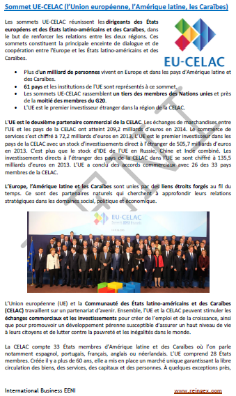 L’unité d’enseignement « Sommet UE-CELAC (l’Union européenne , l’Amérique latine, les Caraïbes) » fait partie des programmes de l’EENI Global Business School :