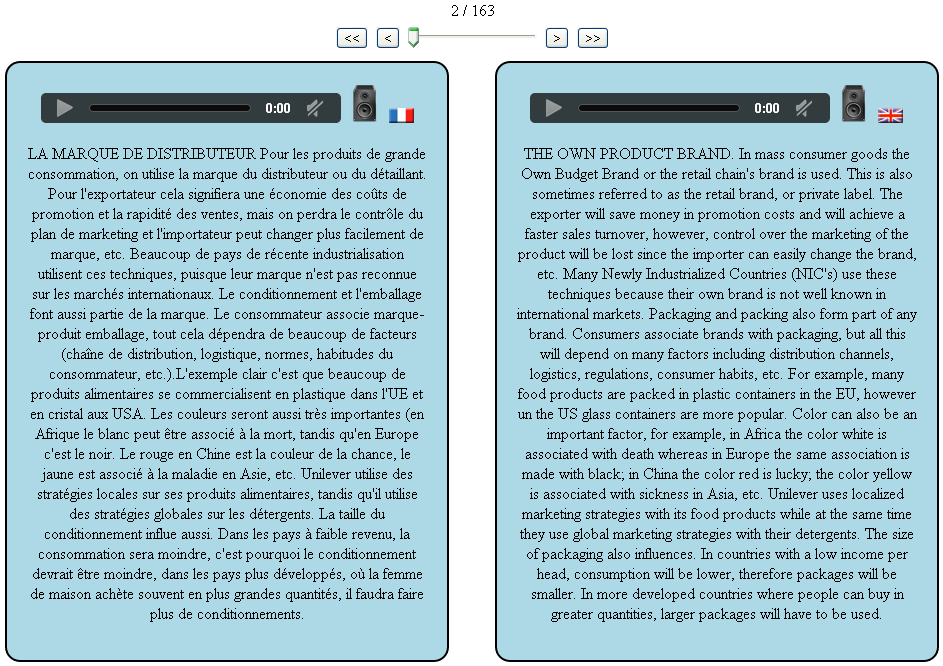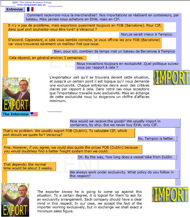 2. Conversation I. L’étudiant dispose d’un texte traduit dans deux langues différentes (en anglais et français) sur des thèmes de commerce international. Il y a environ cent conversations bilingues disponibles. Nous pouvons noter que le même texte est simultanément traduit en français et en anglais.