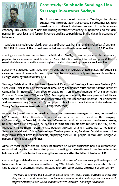 Sandiaga Salahuddin Uno Perekonomian Indonesia. Namun, fluktuasi harga dunia komoditas ekspor tradisional telah menyebabkan perubahan dalam beberapa tahun terakhir dalam struktur perekonomian. Pariwisata adalah mendapatkan suatu sektor lebih penting sebagai penghasil devisa. Agama: Islam (209 juta) - Fiqh (Fikih Islam): Shafi-, Hinduisme (3 juta)EENI Global Business School - Siswa Muslim: